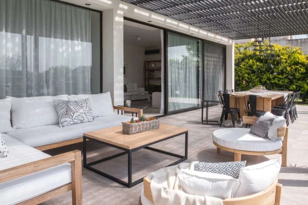 Una zona del living exterior, con sillones en L de Petiribi y almohadones blancos con un toque de color negro de @tintachini, más una mesa con base de hierro y tapa en madera Guatambú.