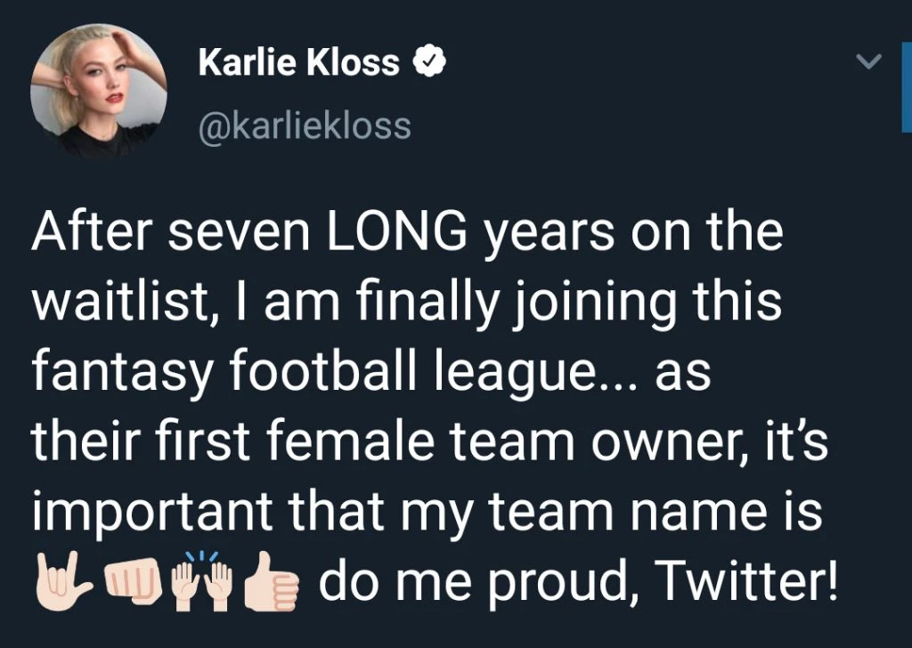 La noticia llegó vía Twitter. La supermodel Karlie Kloss anunció a sus seguidores que era orgullosa dueña de un equipo femenino de fútbol americano (de "football" como se le llama en los Estados Unidos).