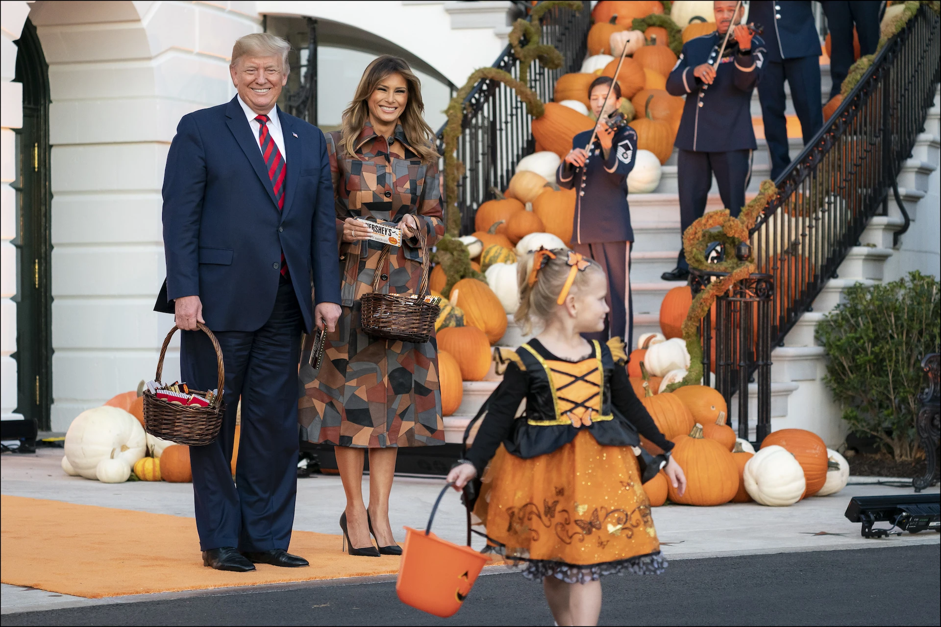 También hubo una alfombra naranja en donde la pareja presidencial se paró con sus canastas llenas de chocolates Hershey's, para repartir entre los niños que se acercaron a decir el clásico "dulce o travesura".