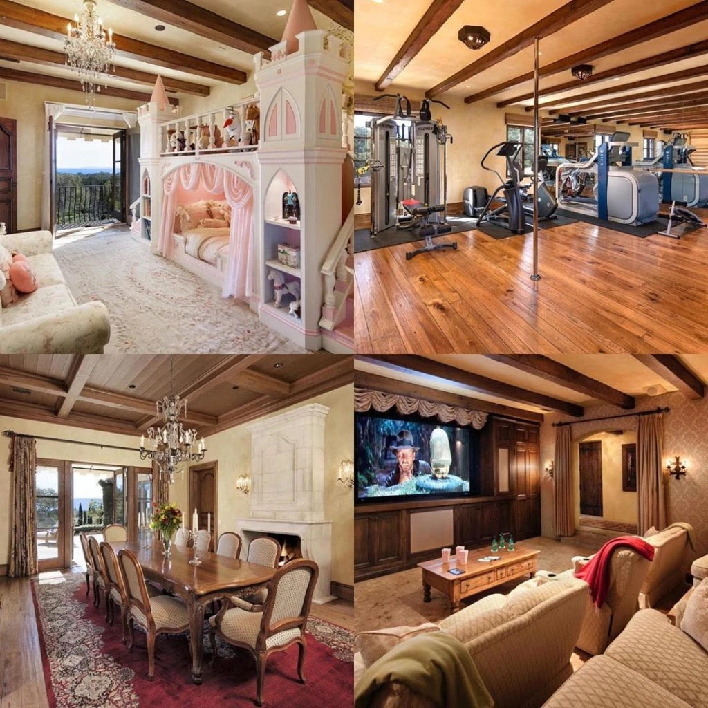 La mansión se construyó en 2003 y cuenta con 16 baños (algunos con chimenea) y 9 habitaciones además de living, más de un comedor, biblioteca, cocina equipada con dos islas y horno de piedra.