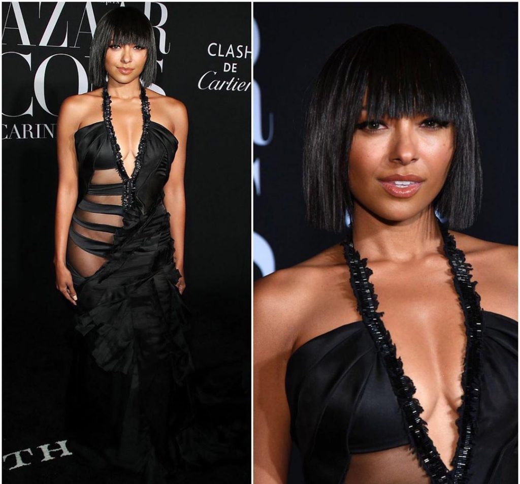 Kat Graham llevó un diseño del mismo estilo pero de la firma Farhad Re a la fiesta de Harper Bazaar, donde coincidió con Barbara Palvin, quien vistió un diseño con transparencias de Dolce & Gabbana.