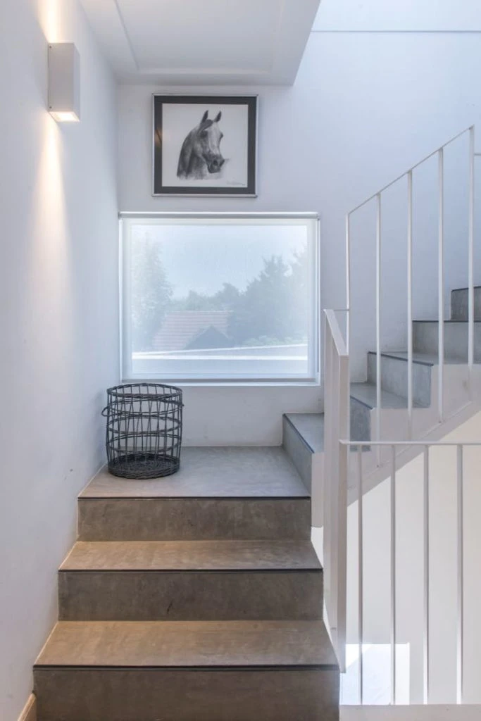 La extensión de la escalera antigua (originalmente en color maíz y que luego fue revestida en microcemento) hacia el altillo se realizó con un tramo moderno y minimalista de escalones de cemento y narices de perfil de hierro en L, apelando al mismo juego de intervenciones de la fachada posterior siendo ambas partes -la antigua y la nueva- tratadas con la misma paleta de color.
