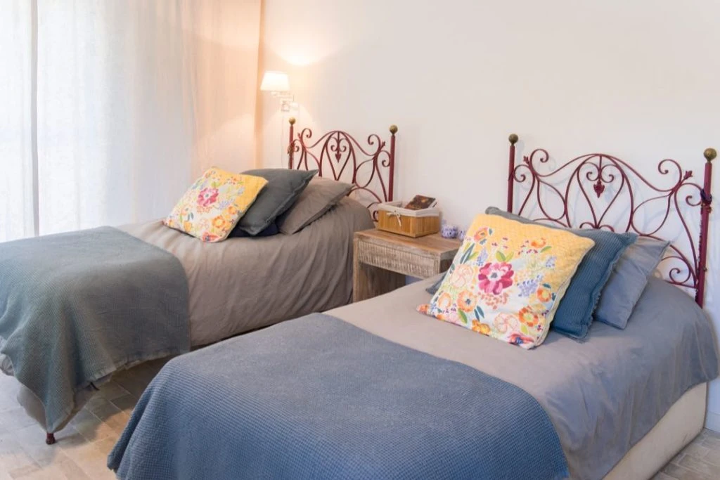 En uno de los dormitorios de las hijas, los respaldos de cama antiguos de hierro se llevaron a un tono rojizo que contrasta con las modernas fundas de acolchado de Tussor color gris y las mantas pie de cama en tela tipo nido de abeja azul petróleo. El toque de color: los almohadones amarillos con flores (www.anthropologie.com/). La mesa de luz es de Petiribi blanqueado y las cortinas de lino off white.