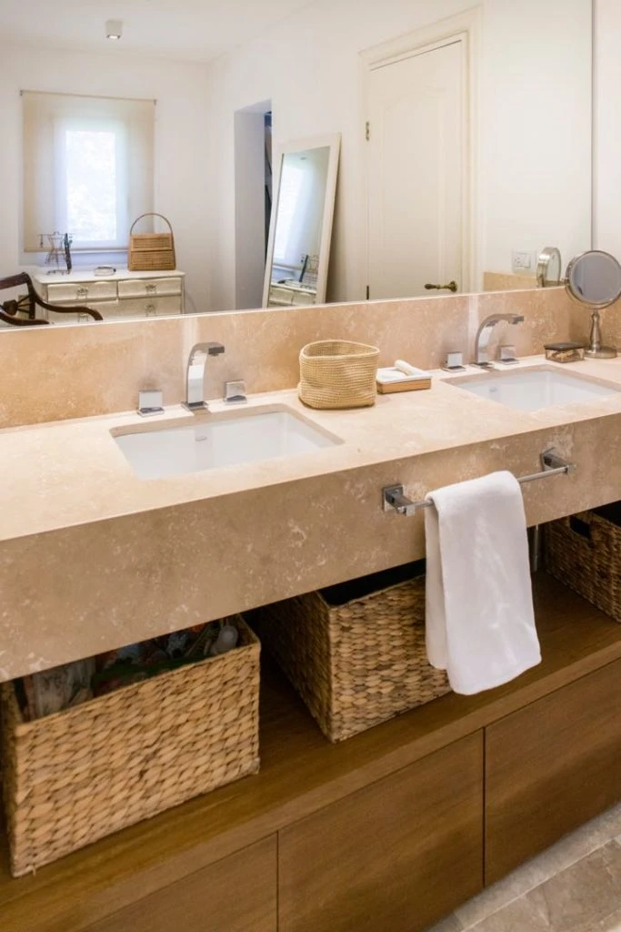 El baño en suite -con doble bacha para mayor comodidad- tiene una mesada con un gran zócalo frontal realizada en travertino pulido y un mueble bajo con cajones hecho en Petiribi a medida.