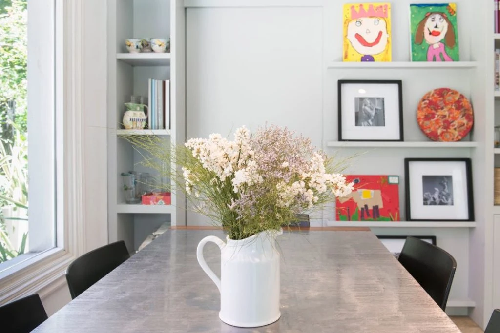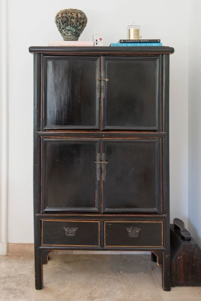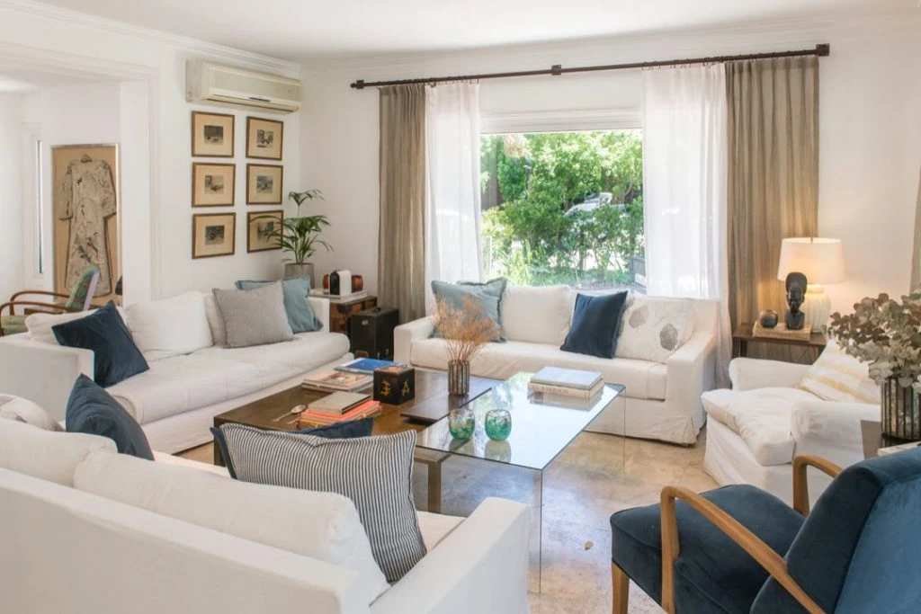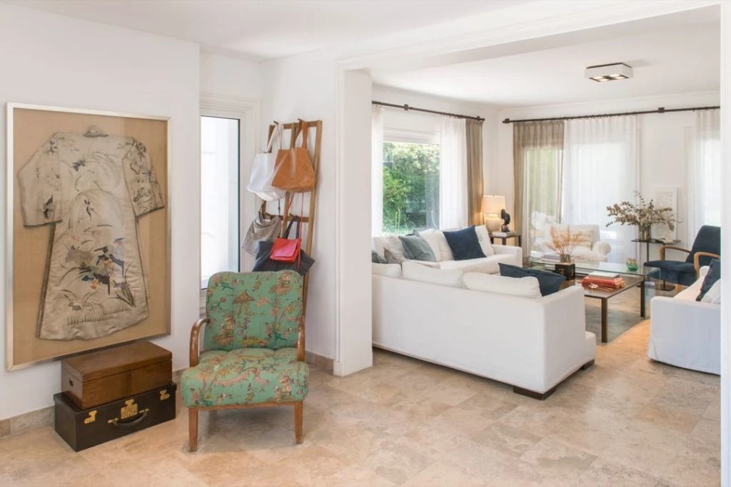 La decoración interior estuvo a cargo de la dueña de casa, Sara Ayerza (@masaideco) que eligió objetos y muebles con historia y valor sentimental, como un kimono enmarcado en la entrada y la caja de magia sobre las mesas de centro: regalos del icónico Mago Fumanchu al suegro de Sara, también mago (Mephisto, el mago de las flores), y el sillón de la entrada, heredado de una de sus abuelas y retapizado en un lino con motivos orientales (www.linosdelpacifico.com.ar).