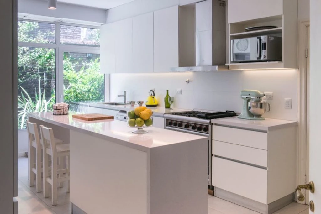 “La cocina fue completamente reformada. Demolimos algunas paredes y la abrimos hacia el exterior con un gran ventanal”, comenta la arquitecta Bechelli. Y agrega: “Como a esta familia le encanta cocinar, agregamos la isla central de Silestone para ampliar las zonas de apoyo, y sumamos espacio de guardado”.