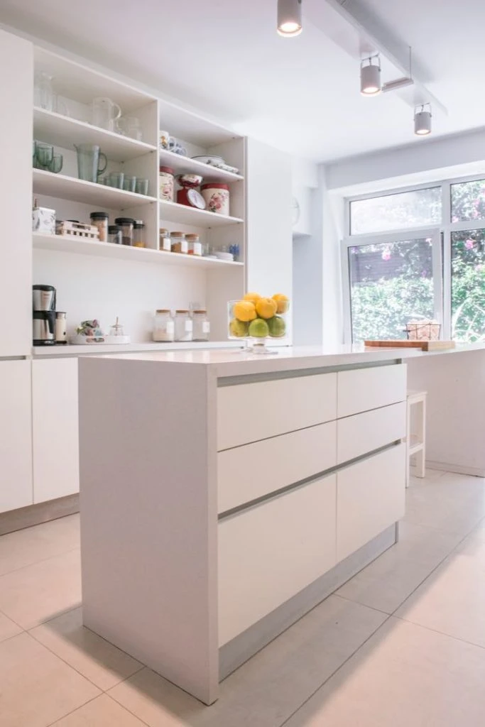 Los pisos fueron reemplazados por baldosones rectangulares de porcelanato en distintos tonos de gris y las alacenas y bajomesadas son de melamina blanca con herrajes ocultos.