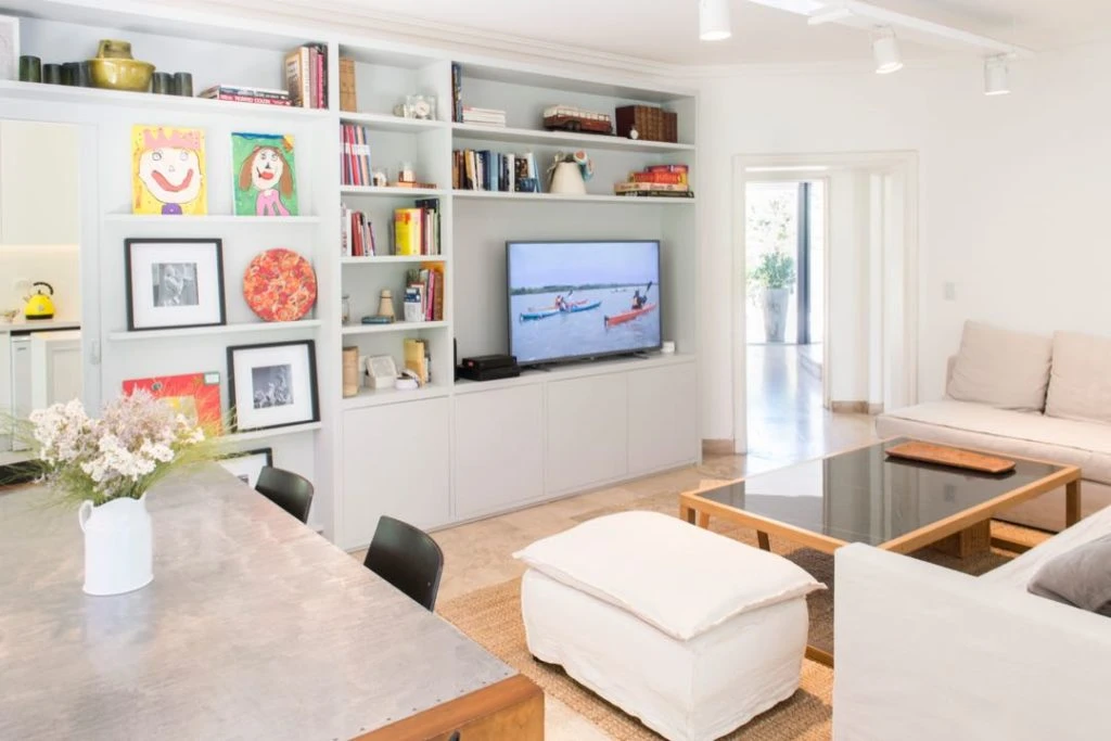 La biblioteca, realizada en mdf pintado, incluye una puerta corrediza que separa el comedor diario de la cocina. “Se nos ocurrió hacer eso ya que no había puerta y era imposible ver televisión y cocinar al mismo tiempo”, explica Sara.