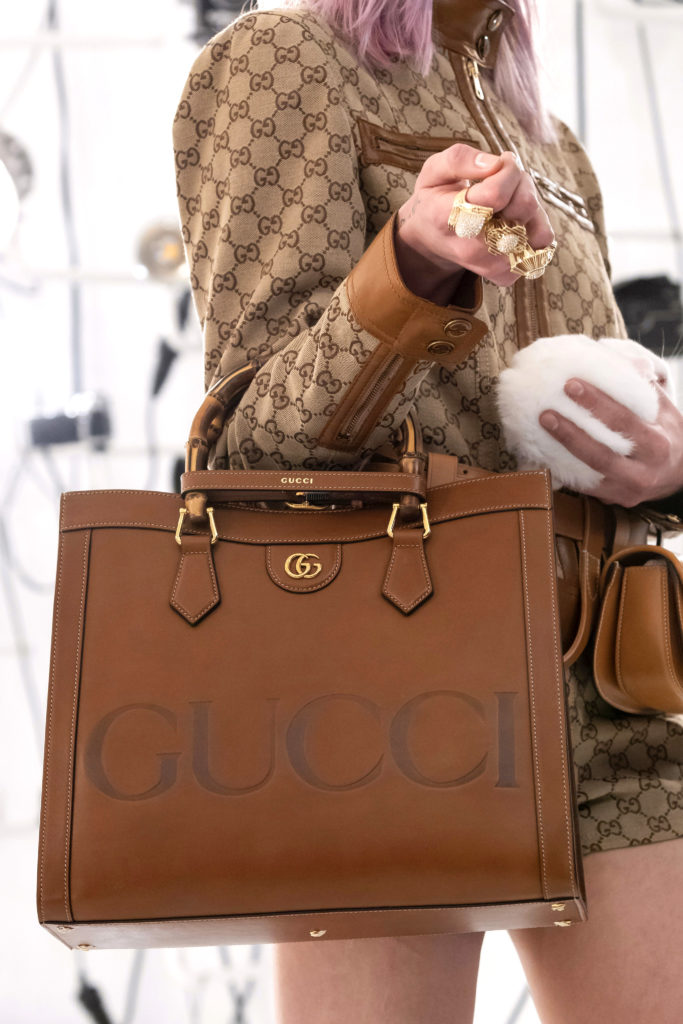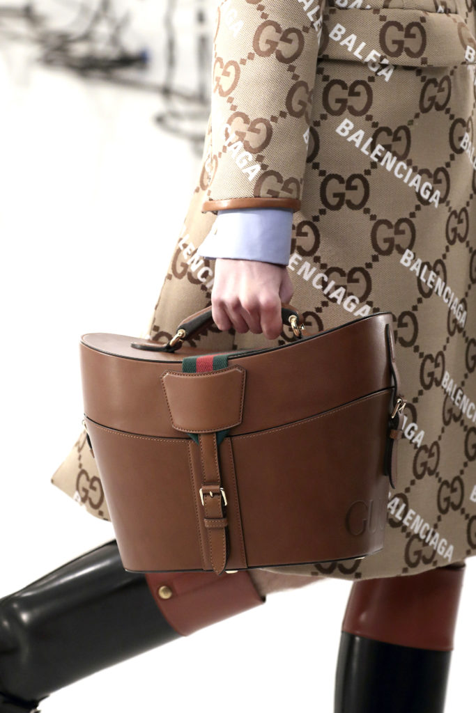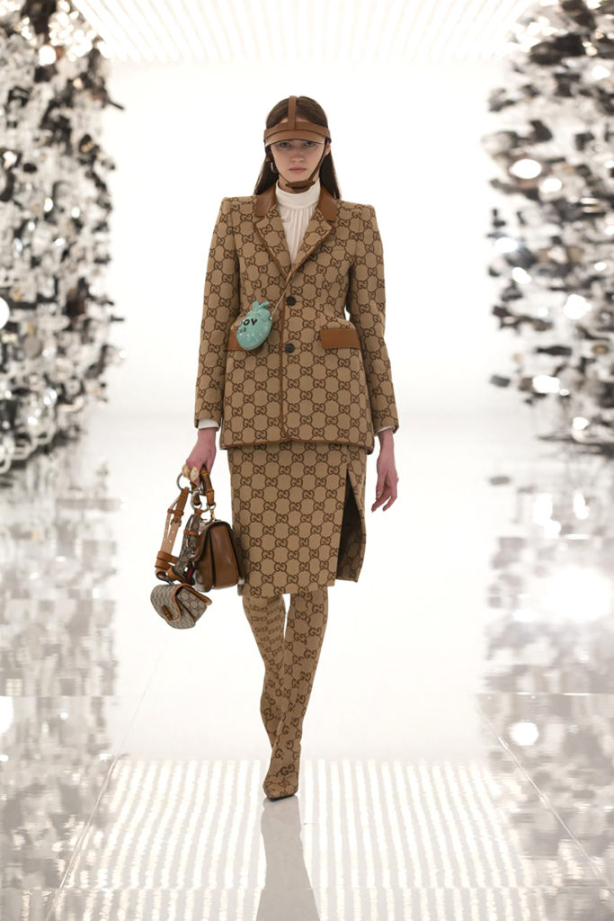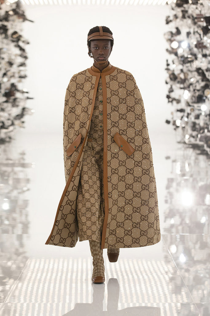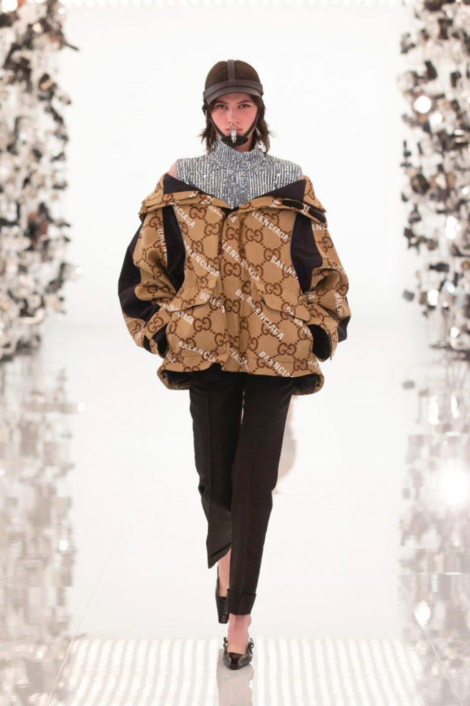 Los logotipos de Gucci y Balenciaga aparecen en la ropa de abrigo con monograma y en trajes de cintura de avispa y hombros marcados.