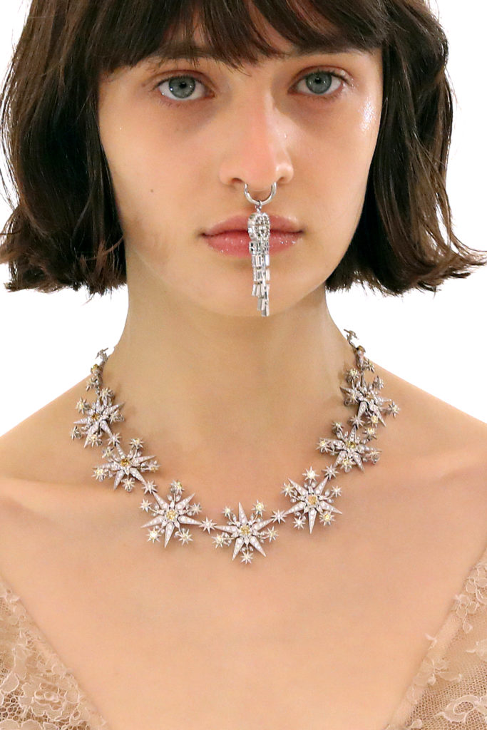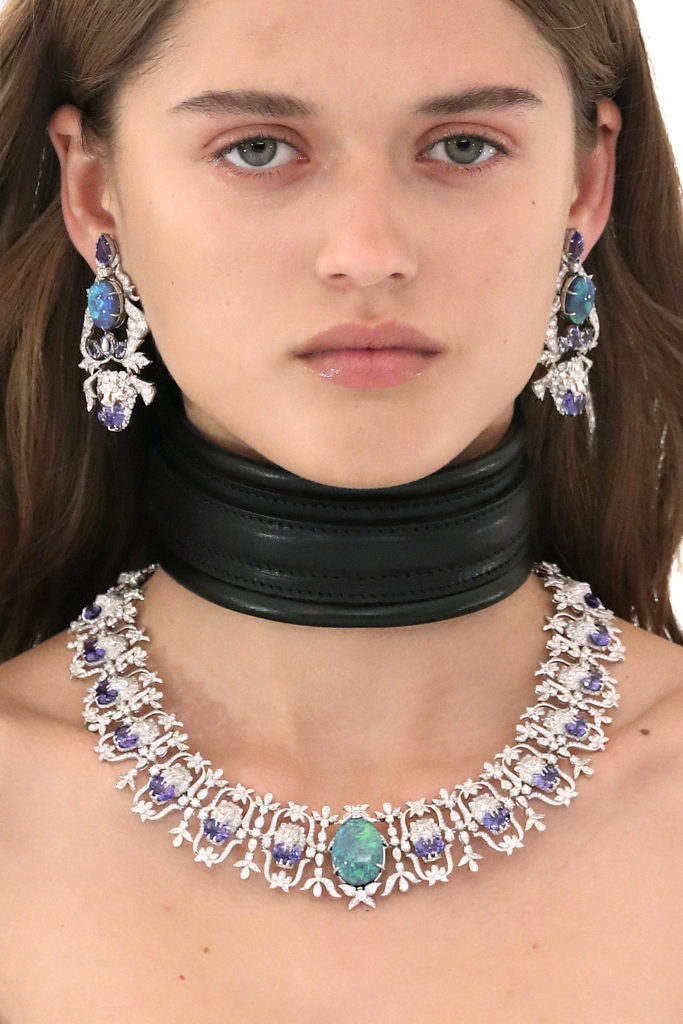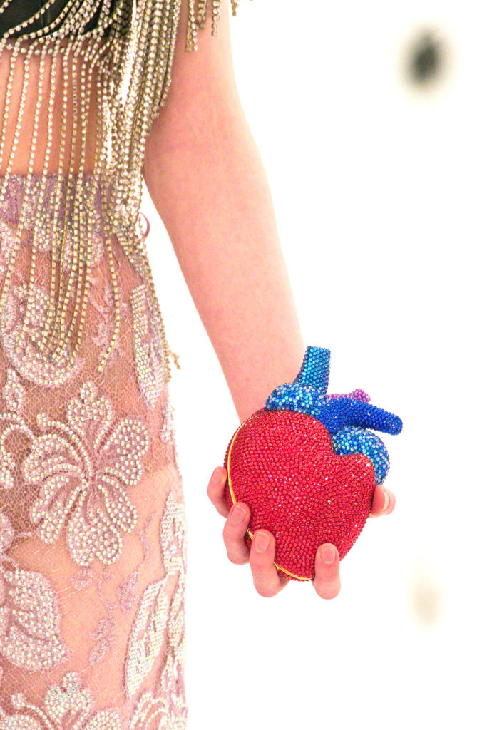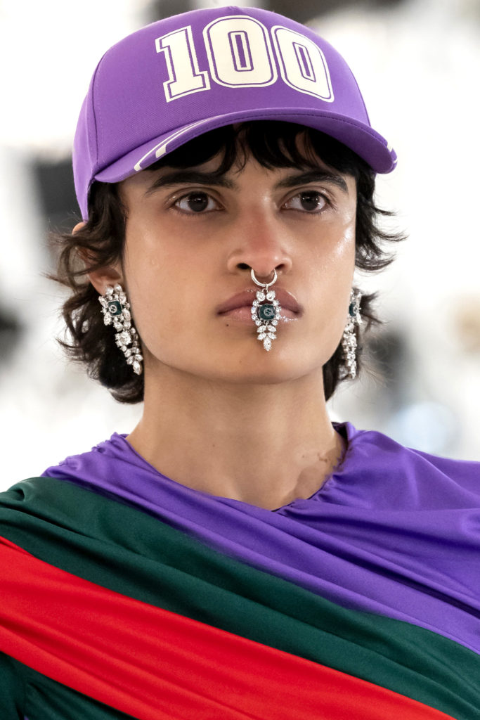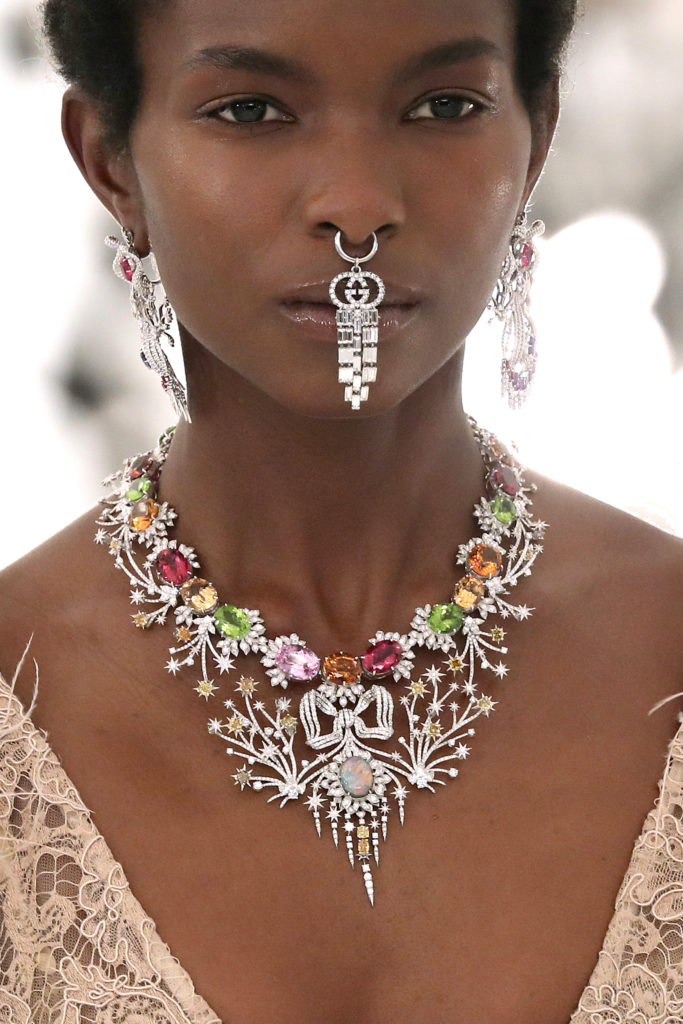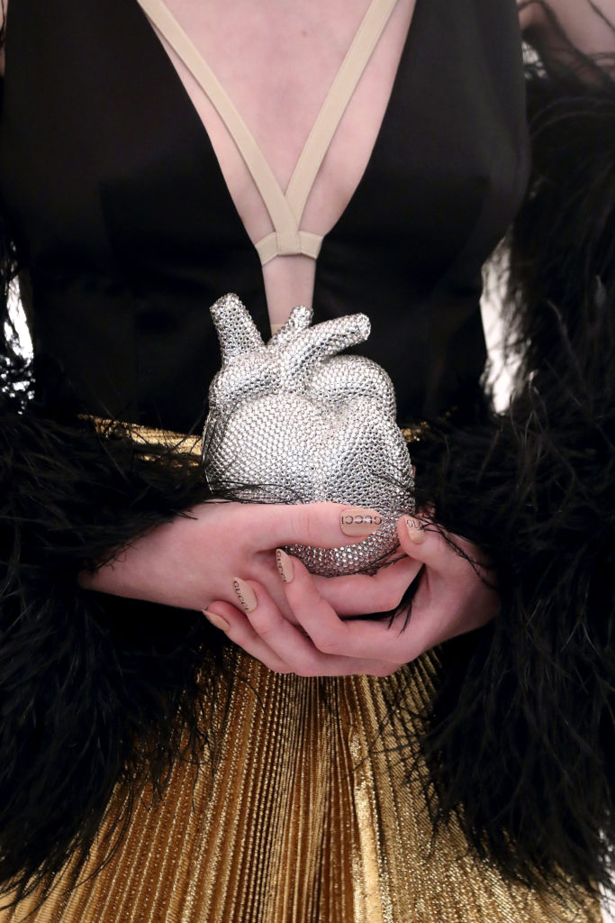 Las piezas de la colección de alta joyería de Gucci, llamada Hortus Deliciarum, se mostraron en la pasarela, incluidos corazones cubiertos de cristal y broches adornados con oro. El sublime traje de terciopelo rojo sobre la pasarela fue todo un símbolo de los 100 años de la marca de lujo.