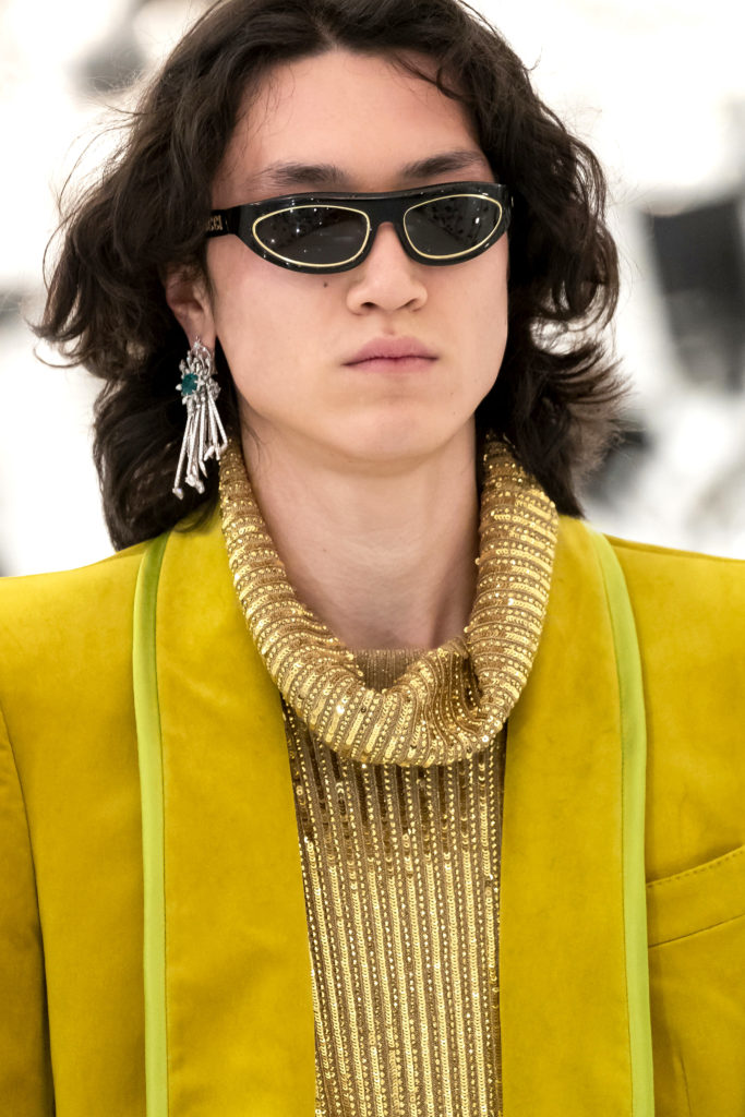 "Gucci se convierte para mí en un laboratorio de piratería, hecho de incursiones y metamorfosis", comentó Michele en sus notas del desfile. "He saqueado el rigor inconformista de Demna Gvasalia y la tensión sexual de Tom Ford; me he demorado en las implicaciones antropológicas de lo que brilla, trabajando en el brillo de las telas; he celebrado el mundo ecuestre de Gucci transformándolo en una cosmogonía fetiche; he sublimado la silueta de Marilyn Monroe y el glamour del viejo Hollywood; saboteé el discreto encanto de la burguesía y los códigos de la sastrería masculina".