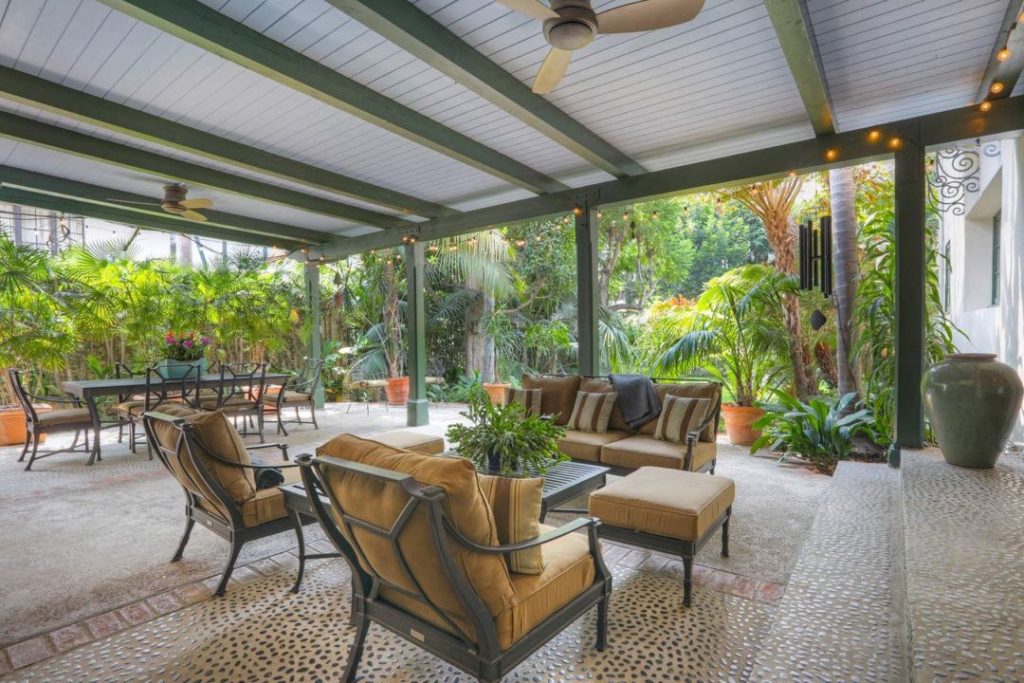 Kristen Stewart eligió una casa rodeada de una vegetación exhuberante. En su contrafrente, la propiedad se extiende en una generosa galería semicubierta y luego un jardín lleno de plantas y árboles, que suma además una piscina de agua salada.