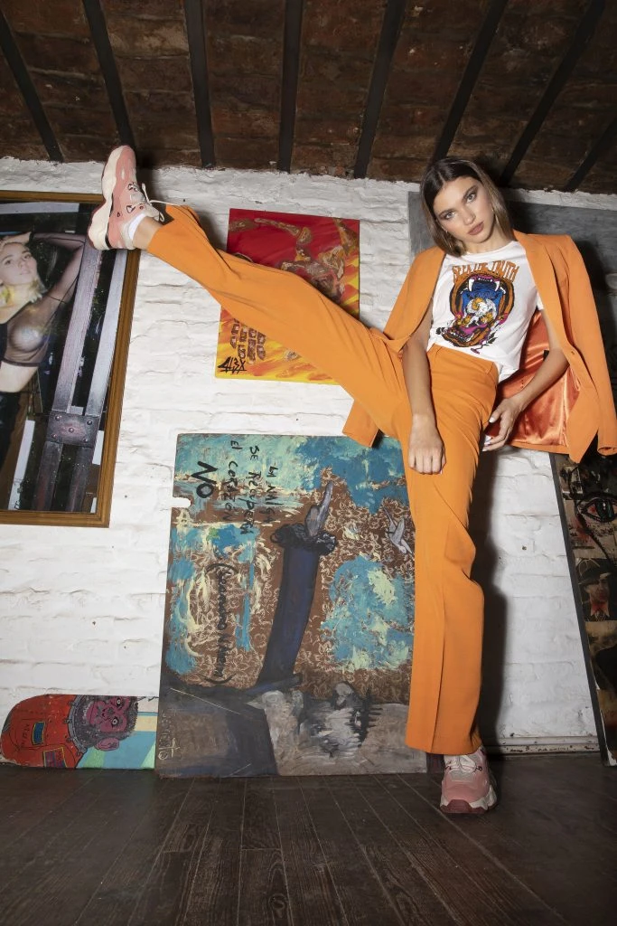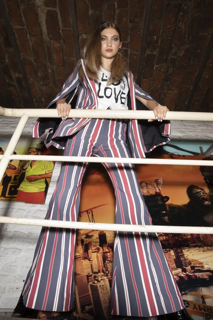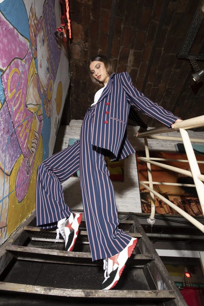 Saco y pantalón rayado ($ 7.350 y $ 4.130, Alló Martínez) y remera estampada ($ 1.832, Las Pepas).