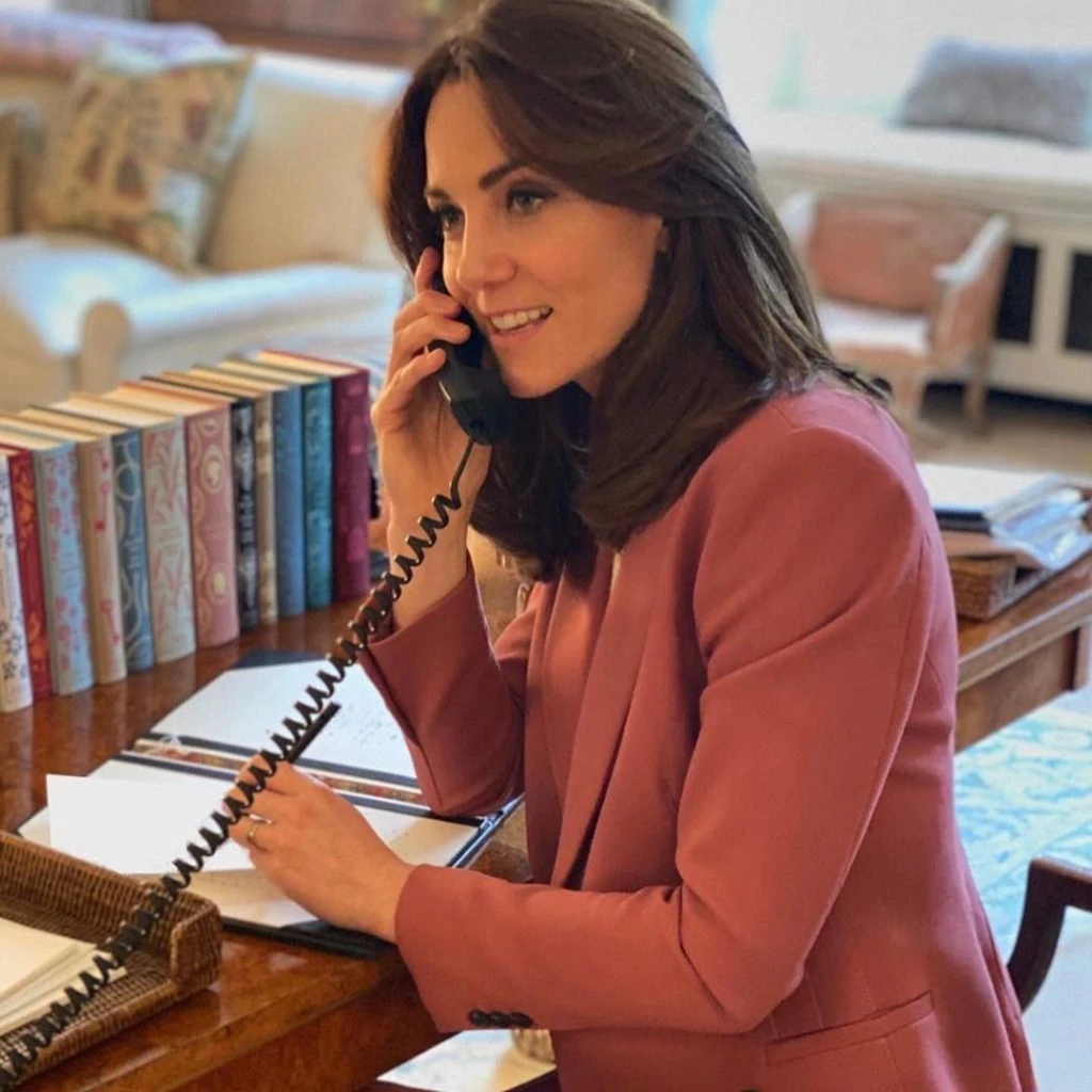 Kate está lookeada con el mismo traje en color rosa viejo de Mark & Spencer que usó cuando visitó junto al príncipe William un centro donde se reciben llamadas con emergencias sanitarias situado en el sur de Londres. Con las piernas cruzadas y teléfono en mano, mientras en la otra sostiene una lapicera, Kate no llama tanto la atención como los libros que están sobre su escritorio.