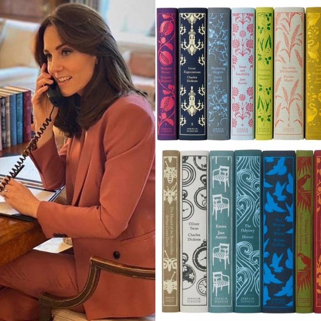 Se trata de una colección de doce novelas clásicas de Penguin con cubierta de tela ilustrados por Coralie Bickford-Smith (con los lomos cubiertos de camafeos, plumas de pavo, mariposas, flores y otros dibujos que parecen escogidas con una intención decorativa, ya que combinan con los tapizados de los muebles que hay en la habitación) e incluye títulos como Middlemarch (de George Eliot), El retrato de Dorian Grey (de Oscar Wilde), Cumbres Borrascosas (de Emily Bronte), Casa desolada y Cuentos de Navidad (de Charles Dickens), La Odisea (de Homero), Don Quijote (de Miguel de Cervantes Saavedra) o Los viajes de Gulliver (de Jonathan Swift), El sabueso de los Baskerville (de Arthur Conan Doyle), Tess de los d’Urberville (de Thomas Hardy), una colección de sonetos de William Shakespeare y hasta cuatro novelas de Jane Austen: Emma, Mansfield Park, Sentido y sensibilidad y La abadía de Northanger.