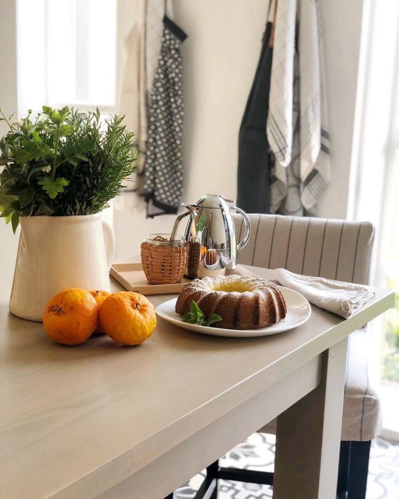 Una vez fuera del horno, la esposa de Mauricio Macri lo espolvoreó con azúcar impalpable y lo decoró con un ramito de menta. Las mandarinas al lado y la jarra blanco con hierbas, son el complemento perfecto para la foto.