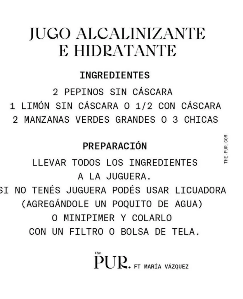 El jugo que ella propone es desintoxicante, súper hidratante y antioxidante. "Es clave para la piel; ayuda mucho a los riñones hidratándolos y oxigenando la sangre", explica María.