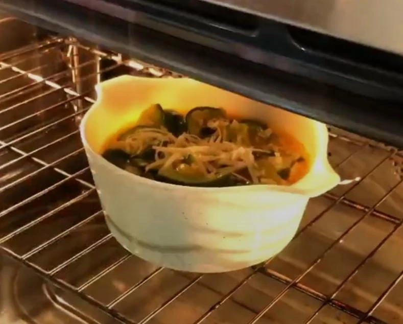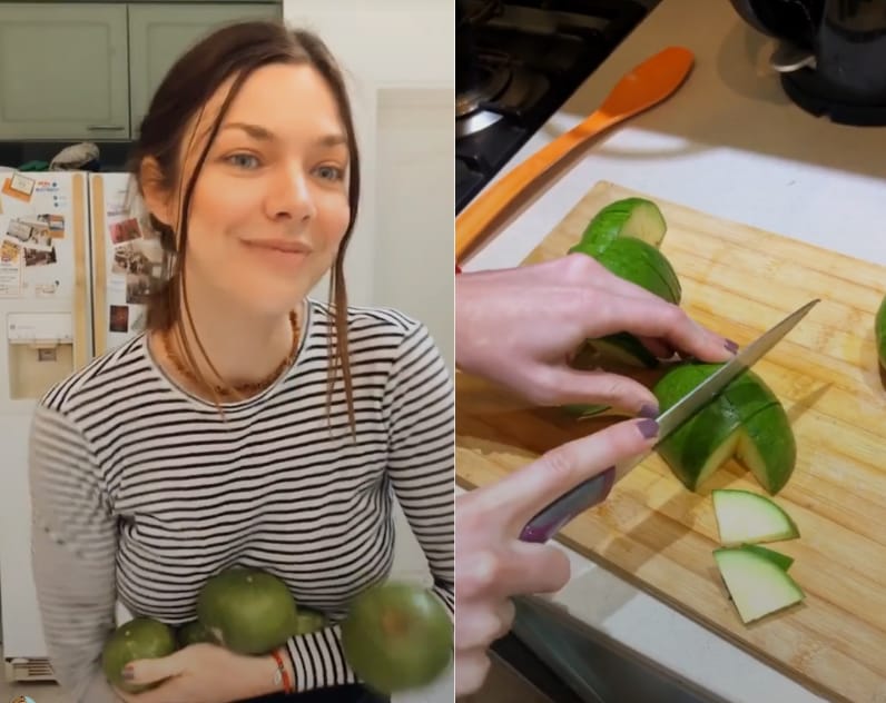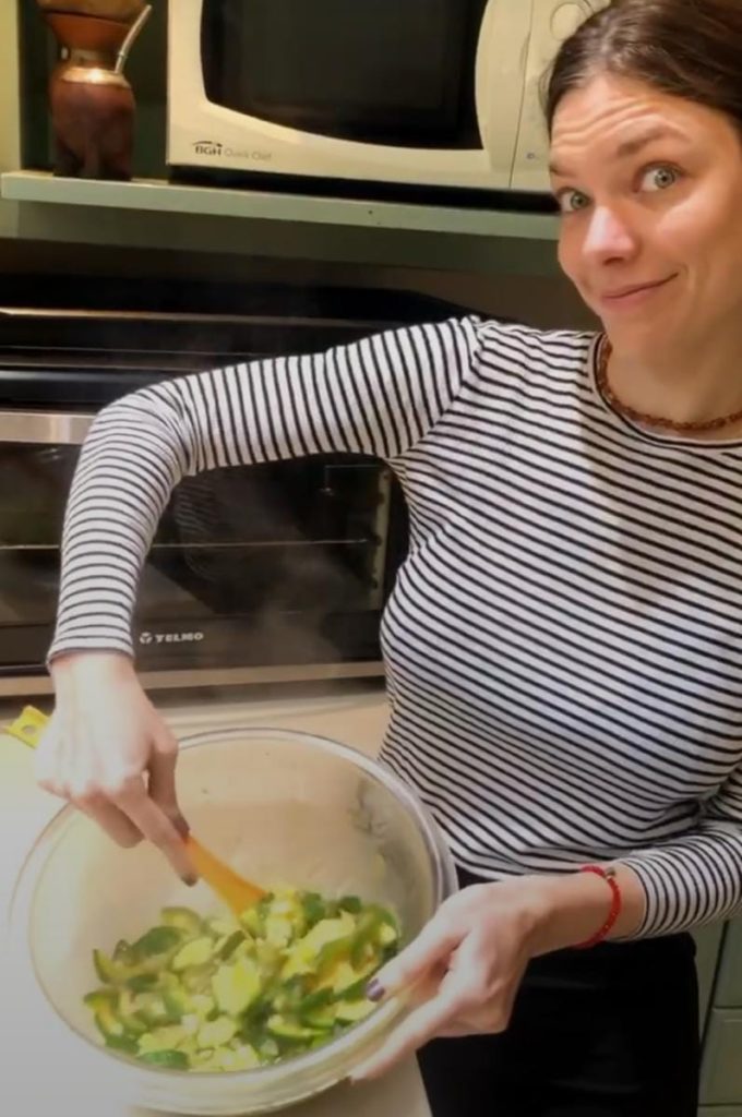 "Incorporá los zapallitos", siguió la modelo mientras que cortaba los zapallitos en rodajas y los sumaba a la preparación sin dejar de remover.
