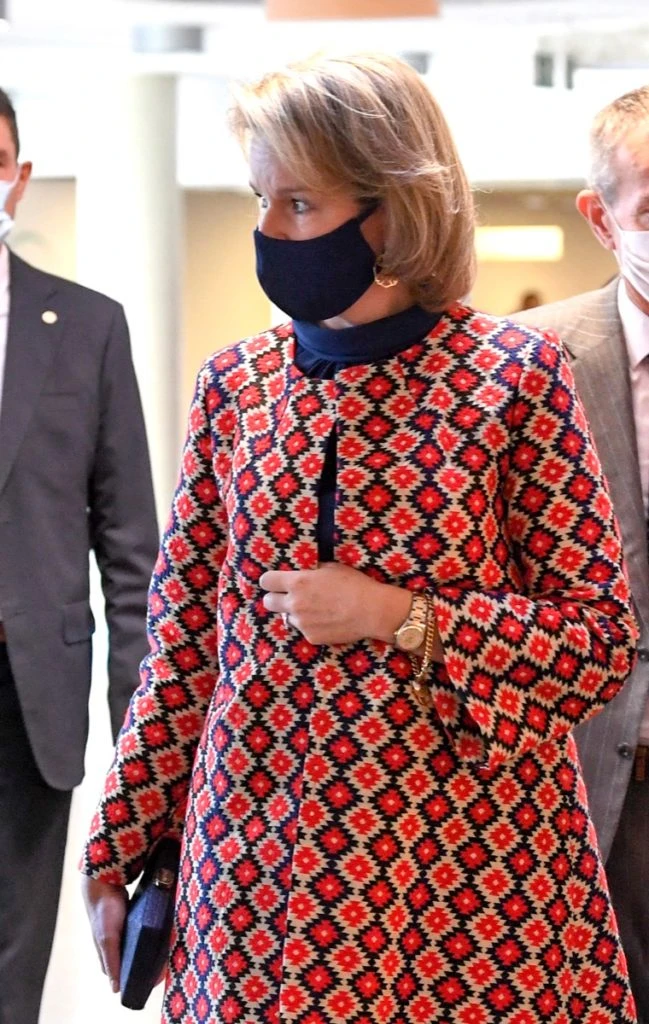 La reina Mathilde de Belgika llevó un tapado estampado súper favorecedor