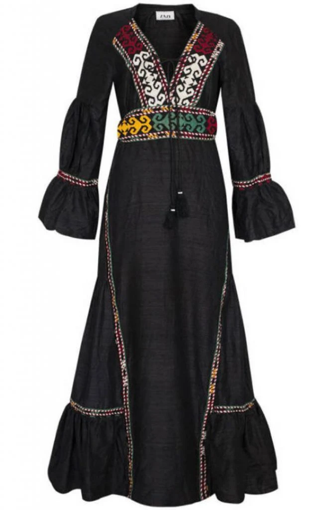 Es negro, largo midi, con mangas abullonadas rematadas en volados, escote en V, y con bordados multicolores étnicos. Tiene la falda ligeramente acampanada y dos grandes volados en el ruedo. Es una pieza exclusiva y de edición limitada