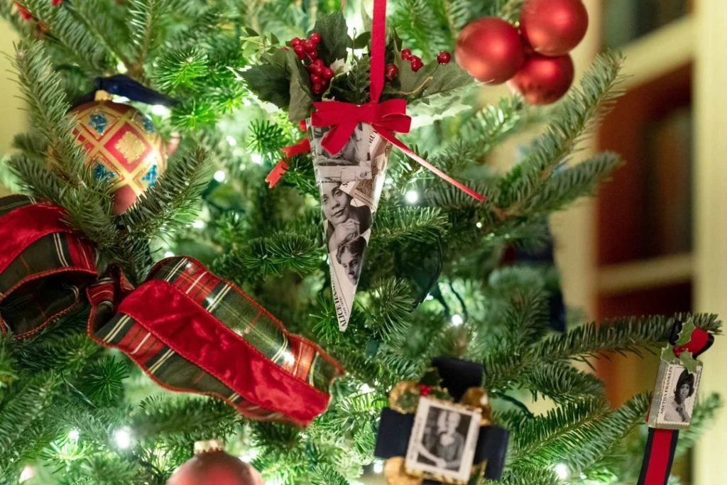 En los salones y galerías de la Casa Blanca, entre las luces y bolas navideñas típicas colgadas de los pinos de Navidad, se mezclan imágenes retro de líderes históricos y artistas norteamericanos.