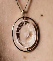 El collar sale 645 euros, es de oro amarillo y tiene un cristal que lleva la inscripción "L´amour", con dos corazón y unas hojas. El cristal se mueve dentro del círculo de oro. Cada pieza es única, varía la forma y el color.