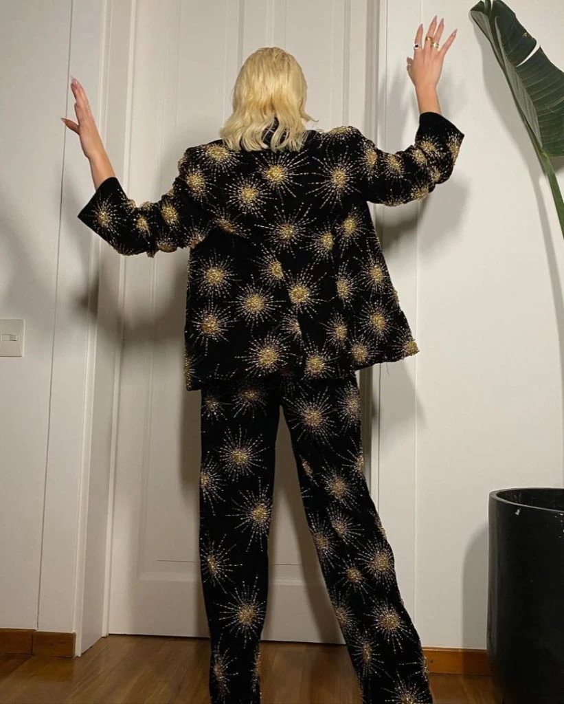 Eligó un suit de terciopelo negro bordado con hilos de lúrex dorados, al que sumó botas negras de tacos XL con plataforma.