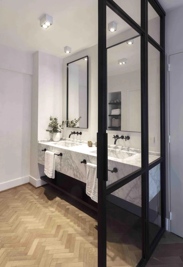 Ni cortinas ni mamparas, mucho menos paredes y puertas. A la hora de compartimentar un baño para separar lavatorios de ducha, la tendencia marca la llegada de los cerramientos de hierro y vidrio. Se los puede ver en grandes paños, con vidrio repartido o paños enteros fijos.