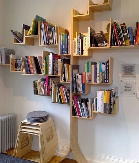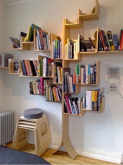 Un diseño de árbol con ramas escalonados que ofician de estantes. El tronco son dos maderas convadas, que se abren apenas en la base. Los estantes en zigzag son de madera enchapada y tienen un tope para que los libros no se caigan.