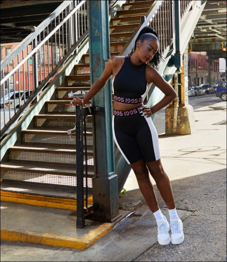 En otras tomas se las ve nuevamente con las calzas ciclistas pero esta vez en una combinación menos urbana y más deportiva. En composé con un top del estilo, el conjunto negro tiene vivos blancos en los laterales y terminaciones con anchos elásticos.