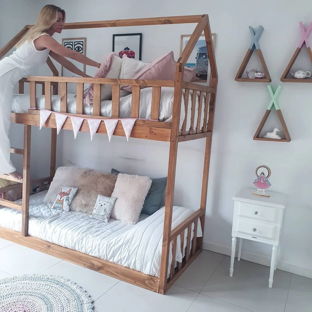 Nicole Neumann adhiere al método y redecoró el cuarto de sus hijas eligiendo la cama casita recomendada como mueble que fomenta la autonomía infantil.