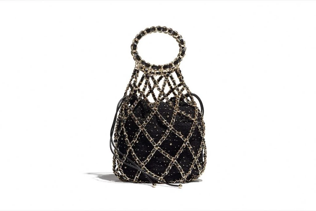 Si buscas algo más grande, el bolso con cordón de tweed negro llega en una red adornada con perlas y cadenas de oro. Foto: Fotonoticias.