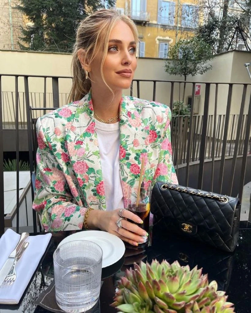 Chiara Ferragni lleva los tonos rosados y verdes de las rosas rococó en su blazer que es una de las prendas comodín por excelencia de esta temporada.