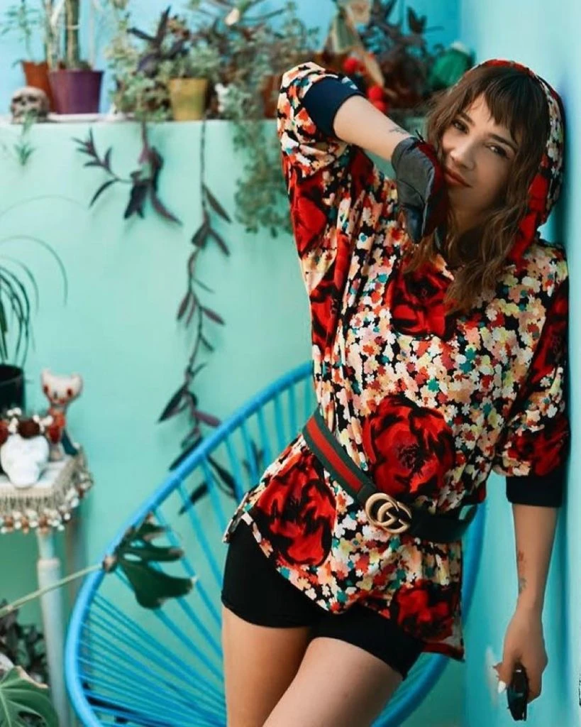 Maju Lozano eligió una camisola para sumar a su jean, look que complementó con botinetas de cuero con detalles metálicos. La estampa es de flores grandes en tonos rosados sobre un fondo predominantemente azul.