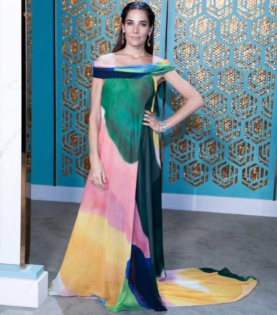 Para la ocación, eligió un mega vestido de gasa bien suelto, con escote bote y con cola y decorado con pinceladas multicolor.