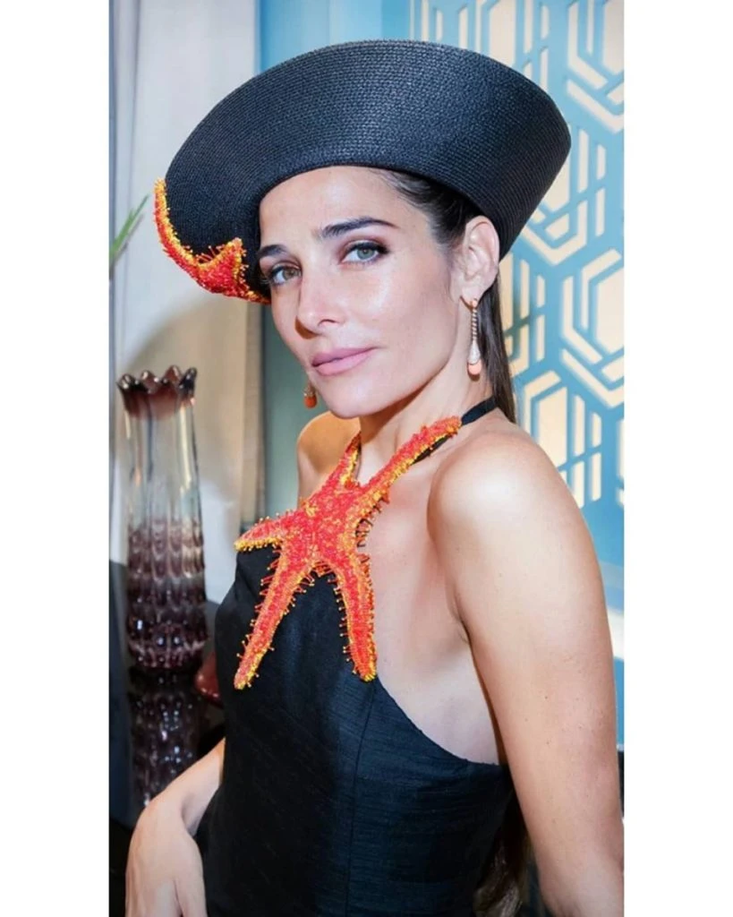 Lució un vestido corto en shantung de seda en color negro con escote halter y sombrero de rafia haciendo juego. Ambas piezas estaban adornadas por un detalle muy especial, una estrella de mar artesanal totalmente bordada a mano.