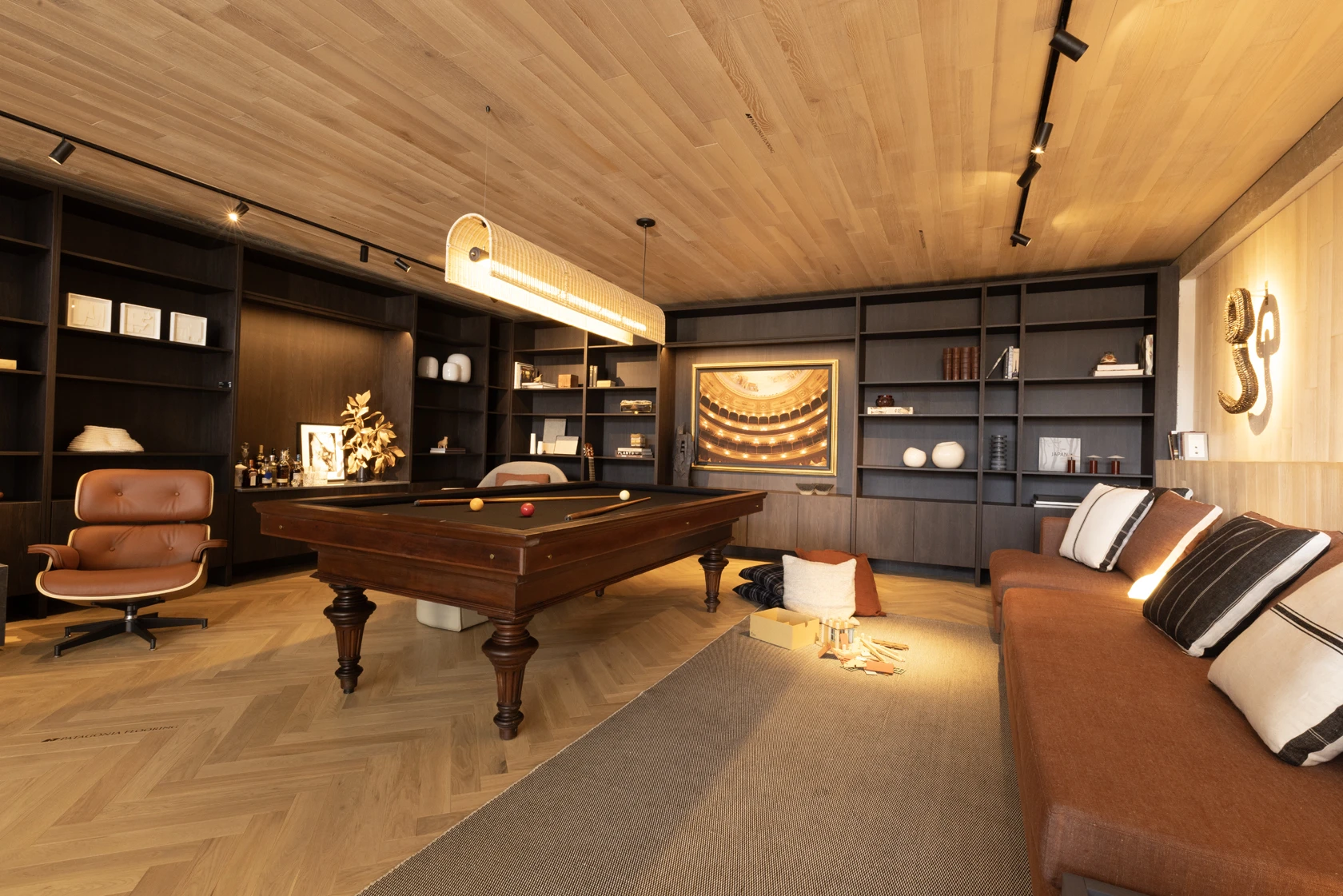 Inspiradas en la imagen de una cancha de tenis cubierta, las diseñadoras construyen un universo donde el juego funciona como metáfora del vínculo. No se trata únicamente de la práctica en sí, sino de todo lo que la rodea, la previa, la charla, la complicidad y el tiempo compartido. En este sentido, el espacio se organiza alrededor de una mesa de billar, que actúa como núcleo y punto de atracción.