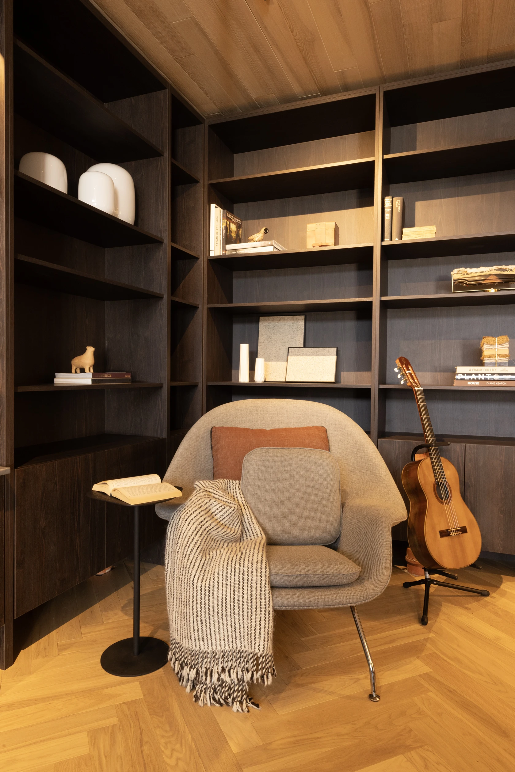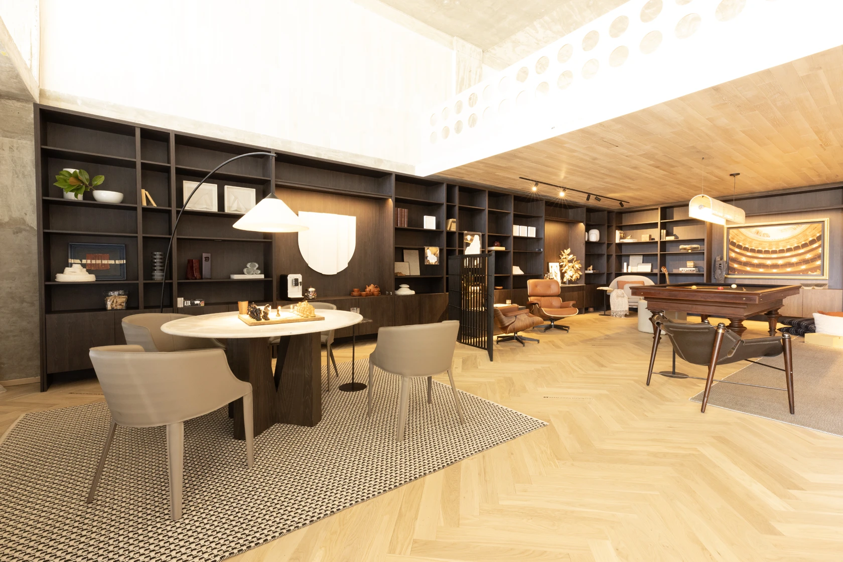 A su alrededor, sillones y poltronas se disponen como si fueran las butacas de un estadio, generando múltiples escenas posibles. El salón cuenta con rincones para leer, conversar, jugar o simplemente estar. Esta disposición invita a una experiencia dinámica, donde cada visitante puede encontrar su lugar dentro del conjunto.