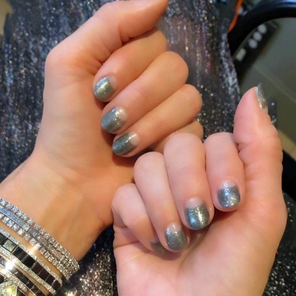 Jessica Alba eligió pintarse las uñas de gris con glitter y dejarse la media luna sólo con brillo.