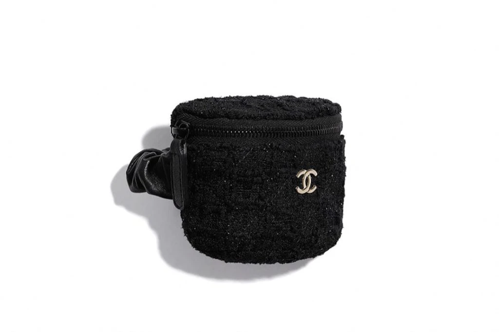 Otra pieza destacada, un mini clutch de tweed, está adornado con el logotipo CC entrelazado de la marca y se completa con una banda de cuero estilo scrunchie, diseñada para llevarse en la mano para una apariencia sin esfuerzo.