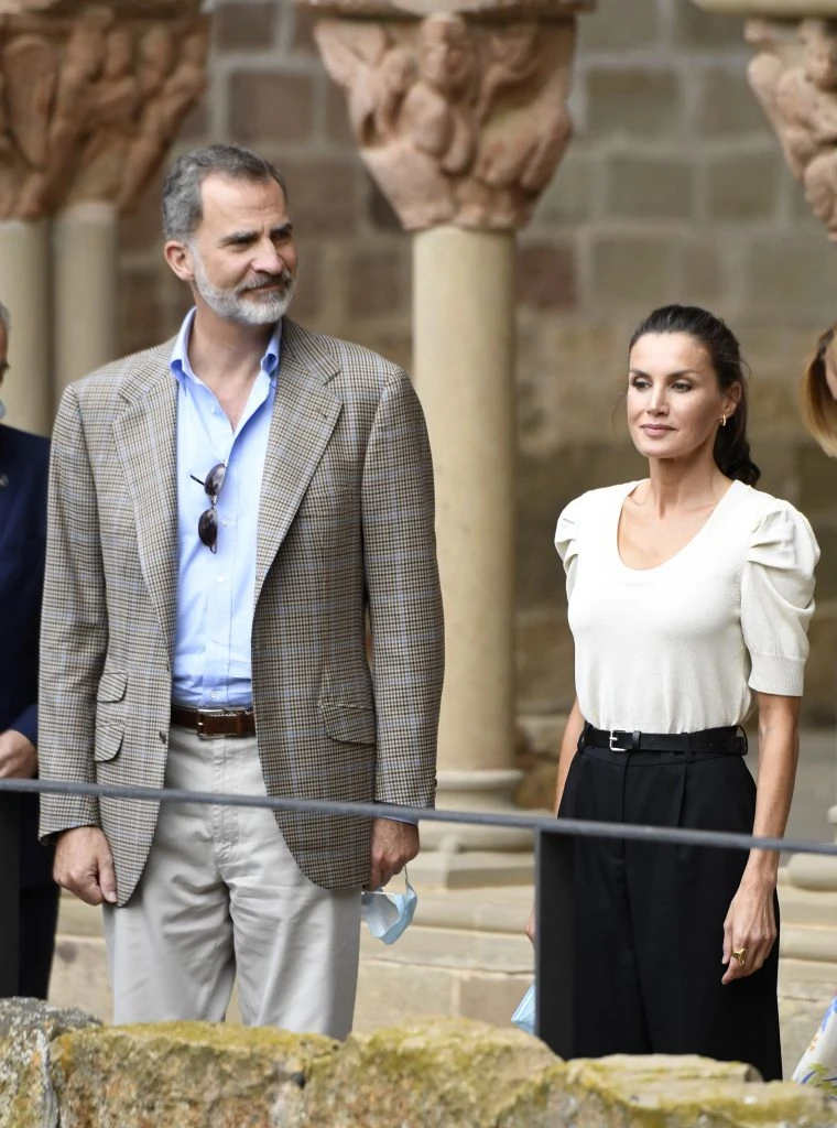 Para esta visita cultural, Letizia Ortíz dejó de lado sus coloridos y veraniegos outfits y estrenó prendas más sobrias.