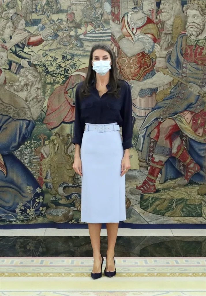 Esta pollera con cinturón haciendo juego, la combinó con una camisa en azul marino lisa con bolsillos en la parte delantera. El mismo look ya lo había usado con anterioridad Letizia en junio del año pasado para una reunión en la Real Academia.