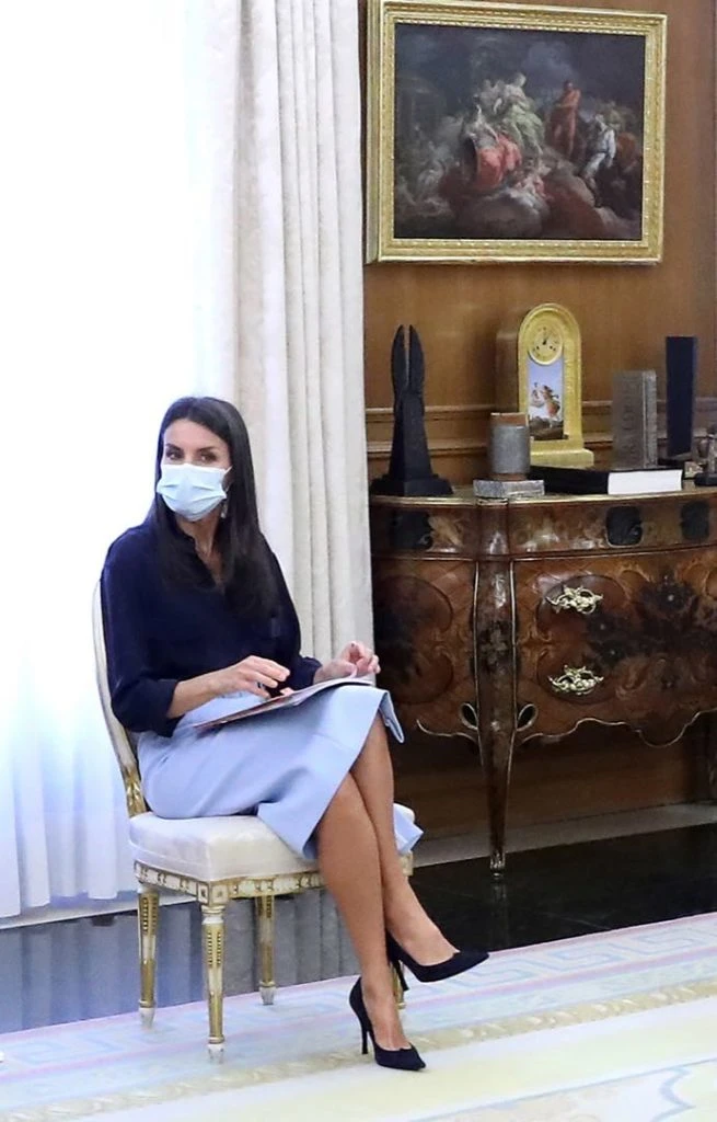 Letizia eligió la falda lápiz de Hugo Boss en color celeste para llevar a dos audiencias que tuvo en el Palacio de la Zarzuela.