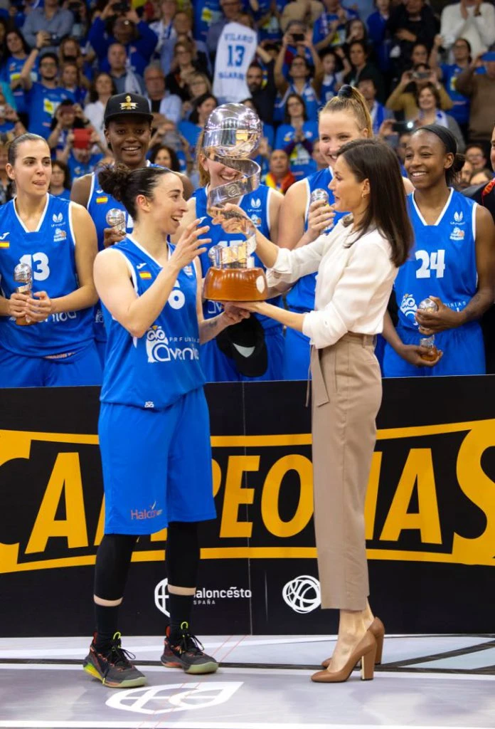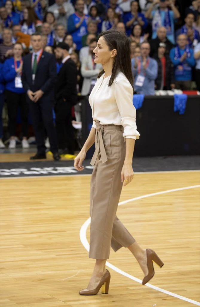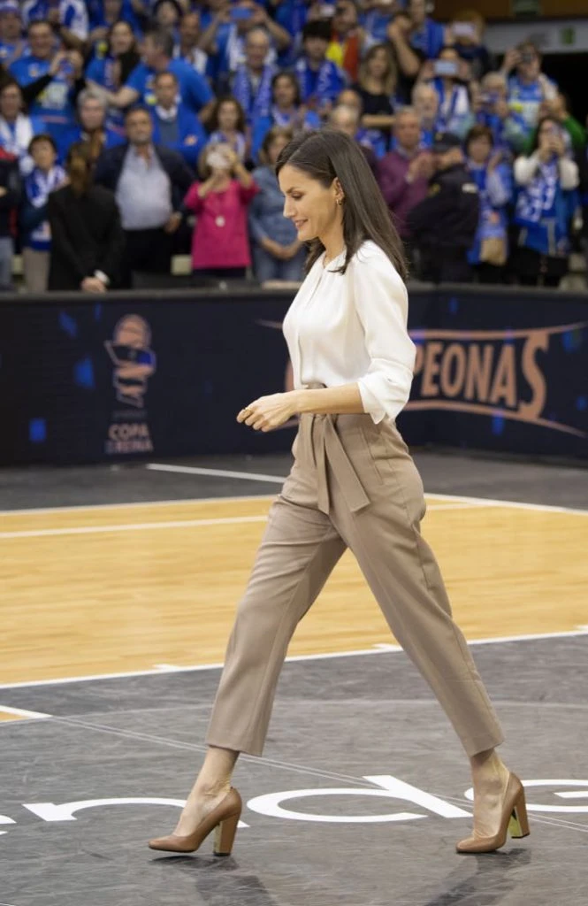 La Reina de España se lookeó con un pantalón de color beige que ya había usado en otras oportunidades (en un evento en el Palacio de la Zarzuela en 2018), para concurrir al partido final de la Copa de la Reina 2020 de la liga femenina Endesa, en la ciudad de Salamanca.