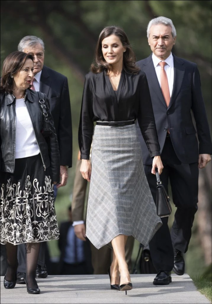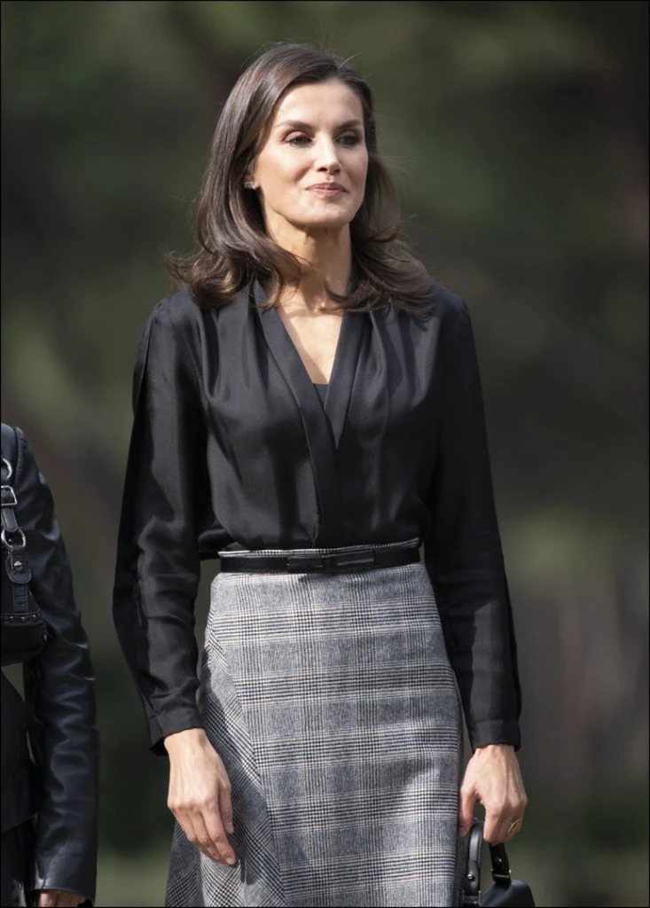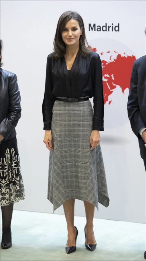 Tal como es su costumbre, recurrió a una prenda que ya había usado con anterioridad (¡Bien por la reina!). Se trata de una pollera con estampado príncipe de Gales, ruedo en picos, largo midi y corte evasé. Es una prenda de Massimo Dutti que había estrenado en febrero durante la inauguración de Fitur con una blusa blanca de gasa con una sobrecapa plisada y mangas abullonadas, de Inditex. Esta vez le sumó otras combinaciones y el resultado fue muy acertado.