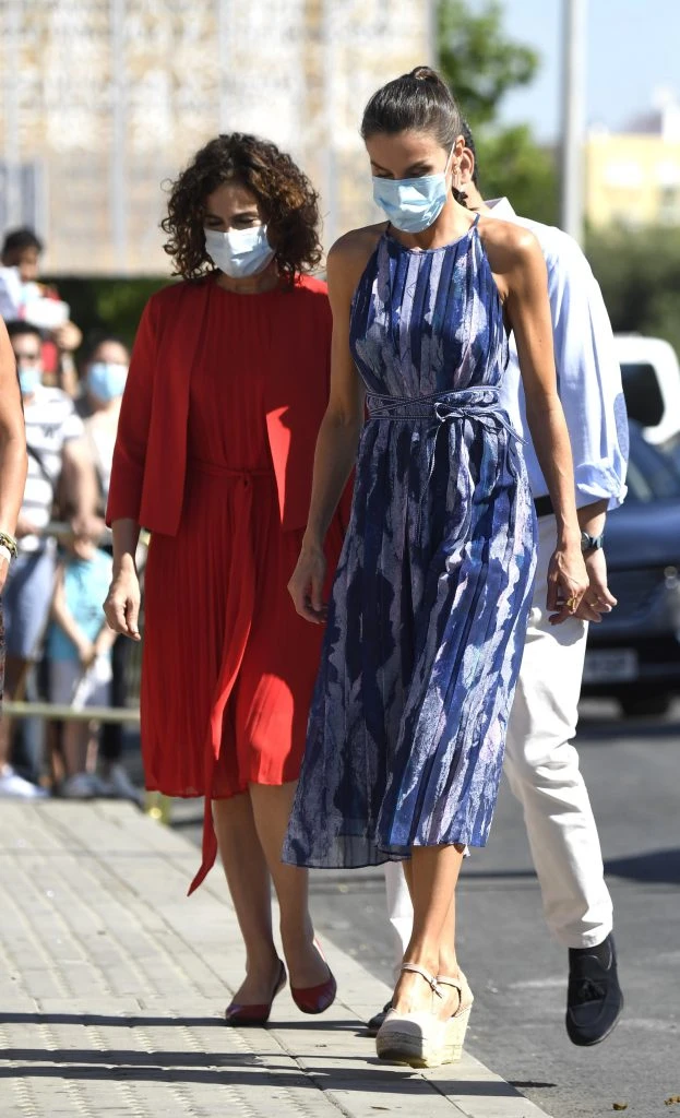 Letizia Ortiz prioriza la comodidad ante todo, por eso combinó su vestido con unas sandalias de taco chino de yute de la marca Macarena Shoes con una leve plataforma así lograba estilizar más su silueta.