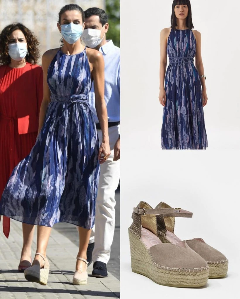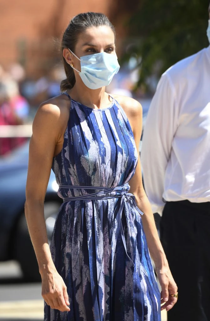 La monarca estrenó un vestido estampado y plisado con hombros al descubierto, largo midi y una cinturón para marcar su cintura del diseñador español Adolfo Domínguez.