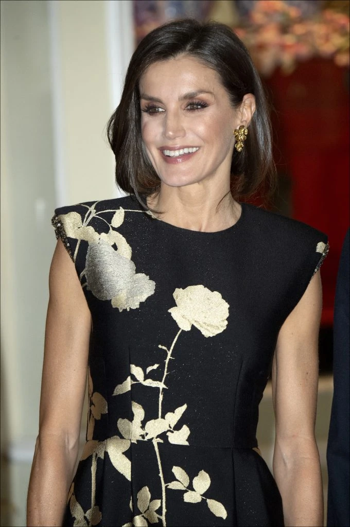 Pero su peinado no fue la única novedad. Su vestido con aires orientales perteneces a una firma que la reina acaba de incorporar a su guardarropas: Dries Van Noten.