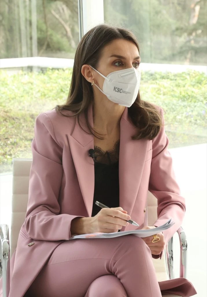 En esta ocasión, la reina de España recuperó de su guardarropas su traje favorito color rosa firmado por Hugo Boss que ya le hemos visto en otras oportunidades.