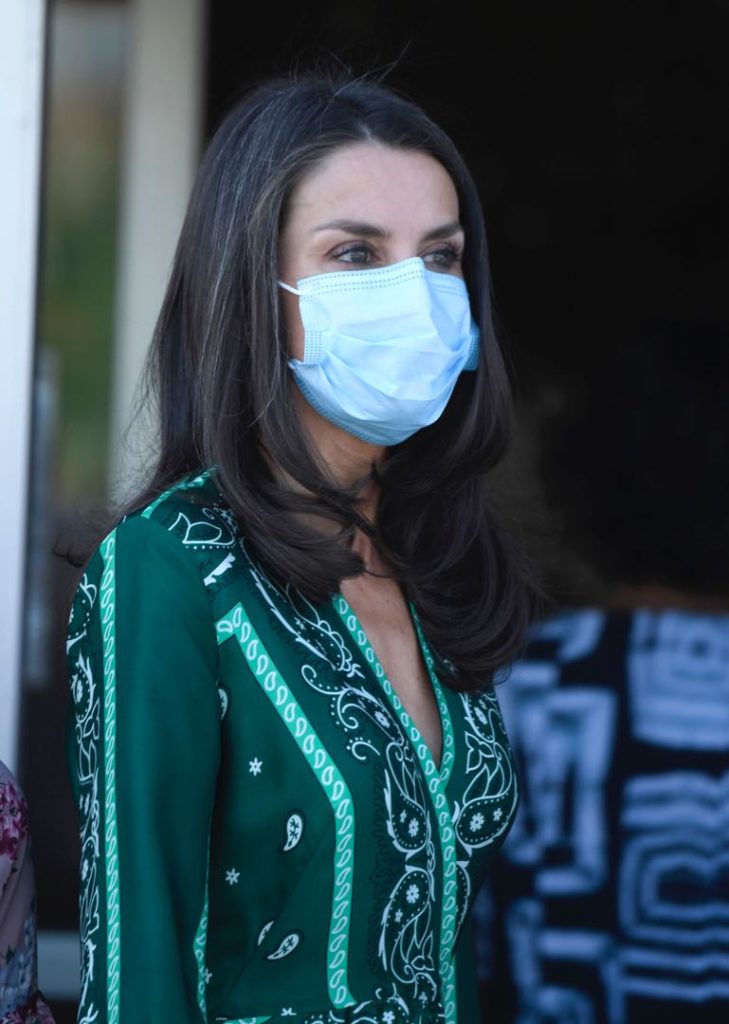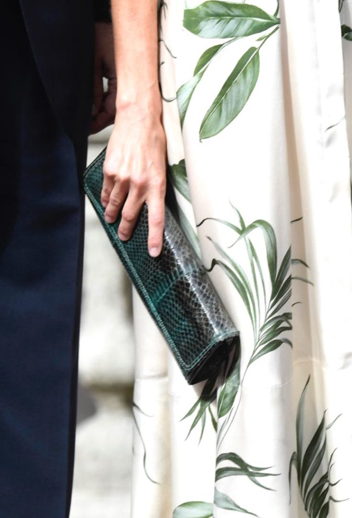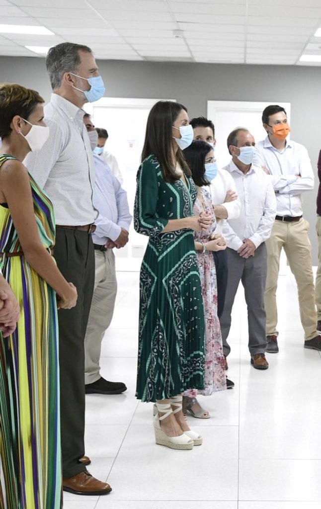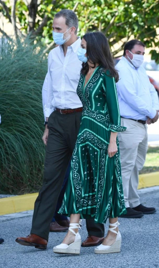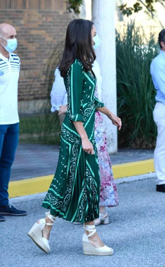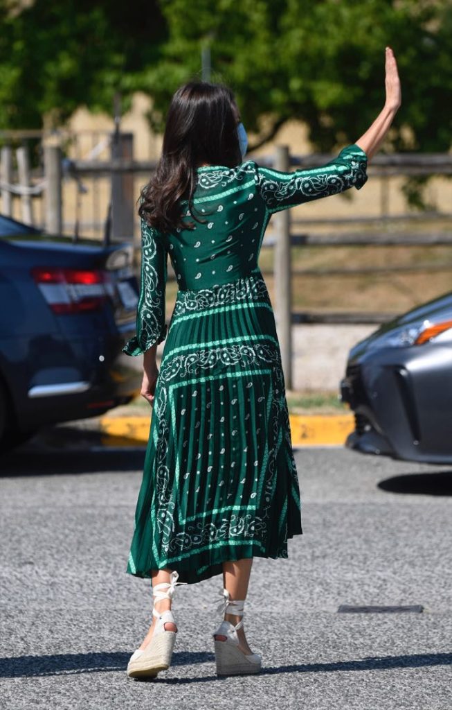 El vestido que eligió Letizia es parte de la colección de verano de la marca y está rebajado ( de 239 euros pasó a 95 euros) en su tienda online. La Reina combinó el vestido con clutch de Lidia Faro en animal print verde, y stilettos nude con pulsera y sin talón, de Carolina Herrera.
